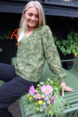 MARTINE LS BLOUSE is our unique long sleeved V-neck blouse with beautiful floral details in an army color.